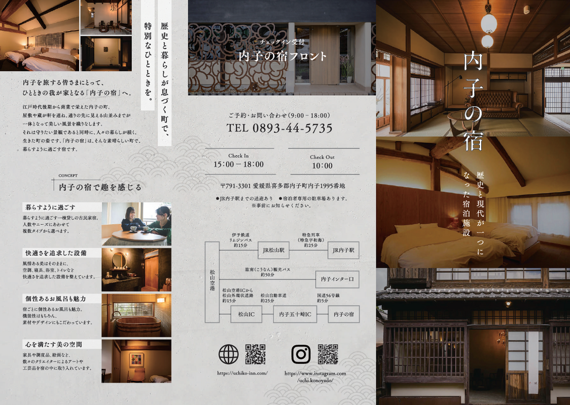 内子町で古民家を改装した宿を営んでおられる「内子の宿」様が、2025年の春に新たに4つの一棟貸しの宿をオープンするにあたり、ウェブサイト制作をご依頼いただきました。「Tradition Meets Modernity ~伝統と現代が融合した宿泊施設~ 歴史が息づく空間で、⽇常から離れる贅沢な時間を過ごす旅」をメインコンセプトに制作しました。ファーストビューでは情緒感あふれる動画をメインビジュアルに据え、「優雅」「贅沢」「特別」なイメージ訴求に努めました。その後パンフレット制作もご依頼いただくなど、印刷物も含めて広範囲でお手伝いさせていただいております。
