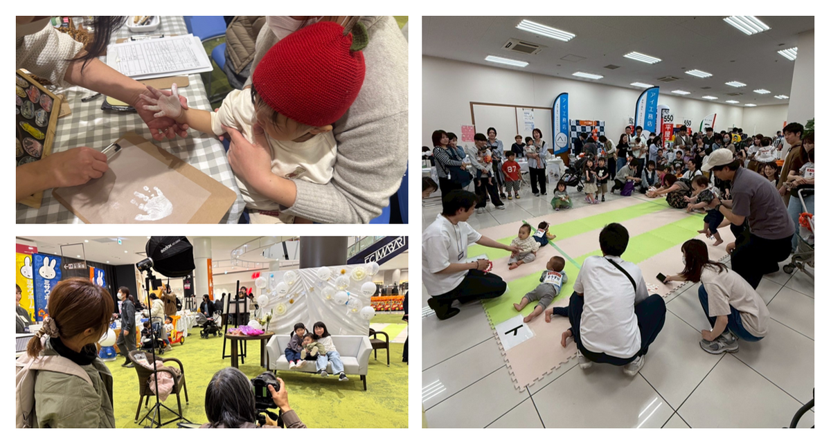 会場により開催内容が異なることがありますが、イベントの内容としては「ハイハイレース」「カタカタレース(手押し車を押してゴールを目指す競技)」「スタンプラリー」「お菓子まき」「ガラポン抽選会」などを行い、賑わいを創出しています。