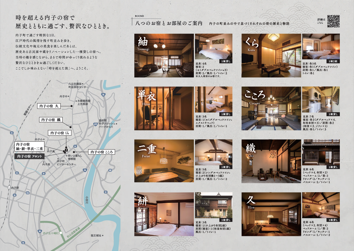 内子町で古民家を改装した宿を営んでおられる「内子の宿」様が、2025年の春に新たに4つの一棟貸しの宿をオープンするにあたり、ウェブサイト制作をご依頼いただきました。「Tradition Meets Modernity ~伝統と現代が融合した宿泊施設~ 歴史が息づく空間で、⽇常から離れる贅沢な時間を過ごす旅」をメインコンセプトに制作しました。ファーストビューでは情緒感あふれる動画をメインビジュアルに据え、「優雅」「贅沢」「特別」なイメージ訴求に努めました。その後パンフレット制作もご依頼いただくなど、印刷物も含めて広範囲でお手伝いさせていただいております。