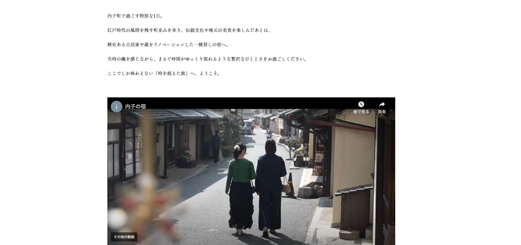 トップページで流している動画は、下層ページ内のコンテンツとしても活用し、本編を閲覧できる動線を設けております。「宿は単独でそこに在るのではなく、あくまで町とともに在る」。そんなオーナー様の思いを汲んだウェブサイト制作、コンテンツ作りを行いました。