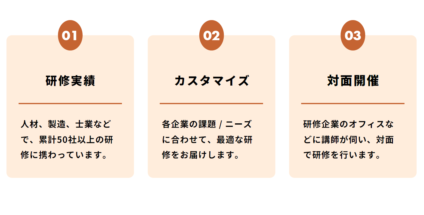 愛媛県内の企業を対象に、株式会社KANNONと連携して「企業別・事業別にカスタマイズしたAI人材育成研修」を提供しています。株式会社KANNONのAI講師は、これまで累計50社以上の研修実績を誇り多くのノウハウを持っています。弊社が提供する研修は、各企業様が抱える課題やニーズに合わせて内容をカスタマイズする点が大きな特徴です。かつ、知識をインプットすることをゴールとせず、実際の業務に落とし込んで実用いただくところまでを研修時間内で目指しています。