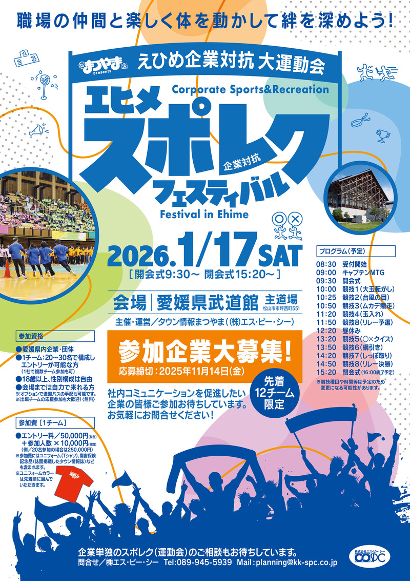 近年「企業運動会」が会社のコミュニケーションツールとして注目されています。弊社エス・ピー・シーでは数百名規模の企業運動会やスポーツ交流イベントの運営経験を活かして、企業対抗運動会「エヒメ スポレクフェスティバル」を開催します。エヒメ スポレクフェスティバルは、福利厚生の一助となる社員の健康促進、コミュニケーションの向上、思い出づくりなど、社員と会社のエンゲージメントを高めるなど様々な効果が期待されます。また、魅力ある就職先としての企業イメージアップにもなる、会社を元気にするためのイベントです。