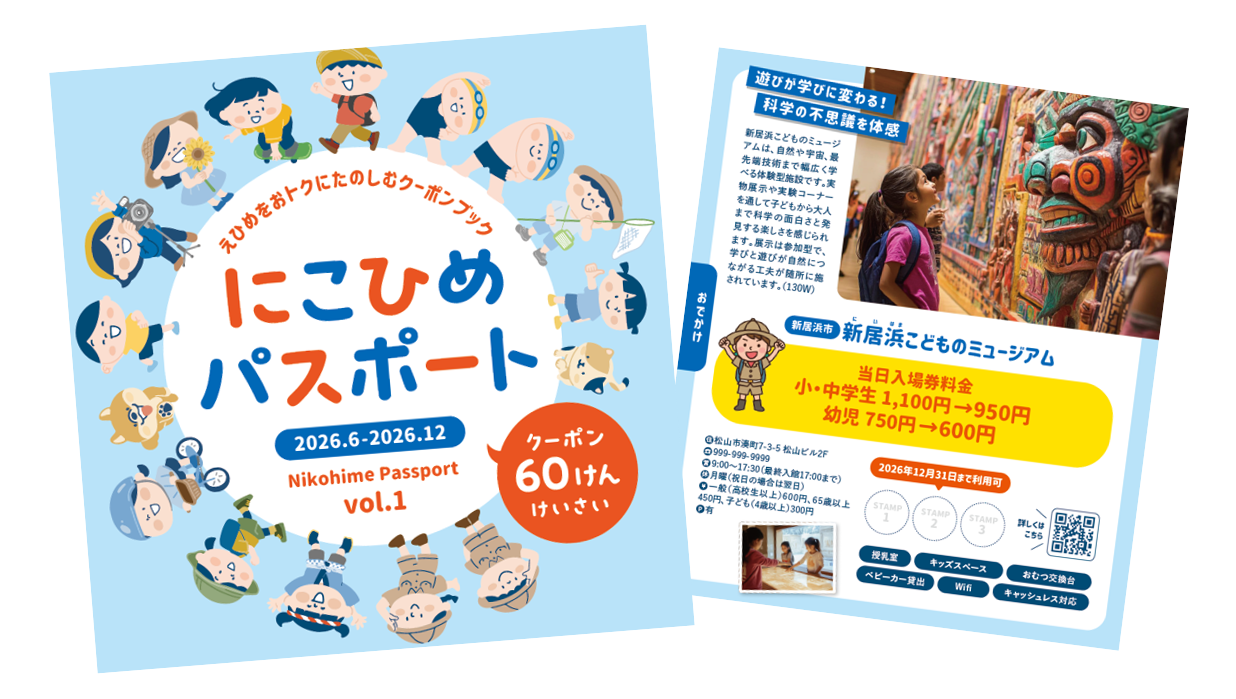 6月と12月の年に2回、愛媛県内の魅力的な施設・観光スポット・飲食店の割引クーポンを集めた冊子を発刊します。先に挙げた自治体の公立幼稚園やこども園・保育所などで無料配布いたします。創刊号の発行部数は15,000部を想定しております。本冊子への広告出稿も可能です。ぜひご検討ください。