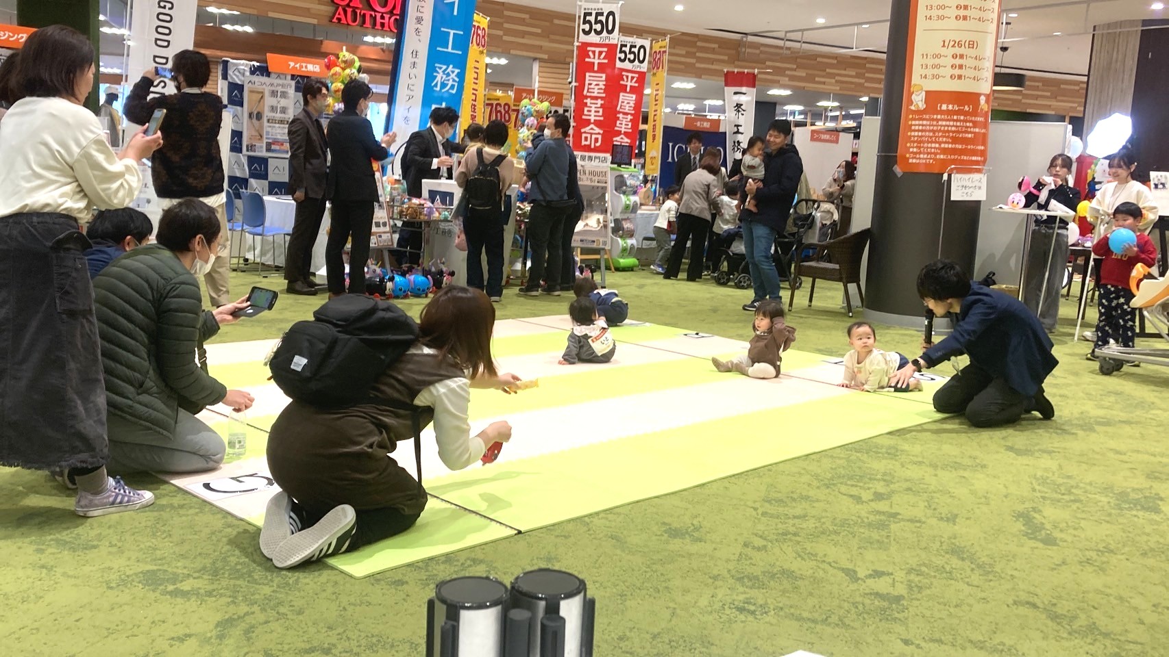 会場により開催内容が異なることがありますが、イベントの内容としては「ハイハイレース」「カタカタレース(手押し車を押してゴールを目指す競技)」「スタンプラリー」「お菓子まき」「ガラポン抽選会」などを行い、賑わいを創出しています。
