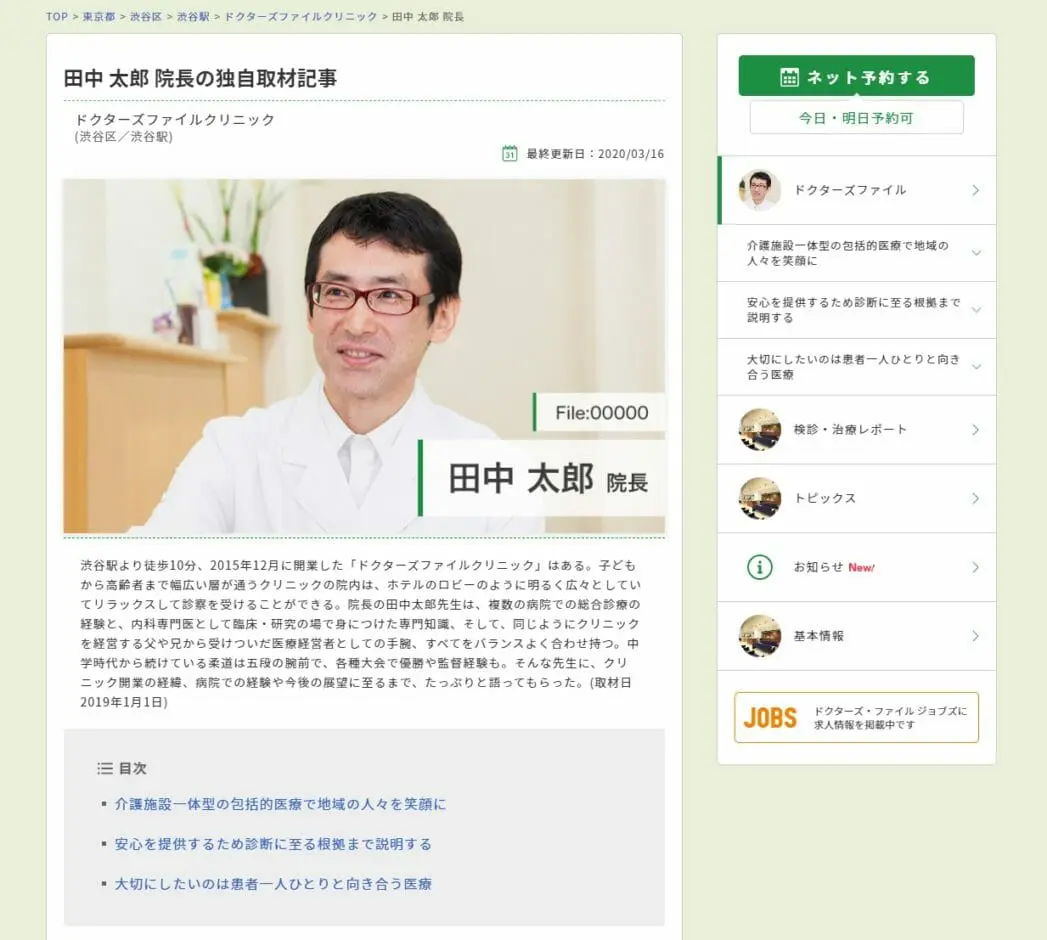 ドクターズ・ファイルは、患者とドクターの心の懸け橋になることをめざす総合医療情報サイトです。誰もがより便利に、より快適に医院・病院を探せるようにとの想いから2010年にスタート。一人ひとりのドクターに丁寧に取材を行い、クリニックの診療方針・特徴からドクターの人柄までをまとめたインタビュー記事を作成してきました。診療科目、行政区、特徴のほか、気になる症状や病名からも検索できるなど、患者であるユーザーの幅広いニーズに応えています。掲載をご希望のクリニック様は、ぜひお気軽にお問い合わせください。